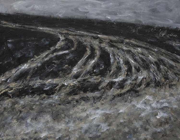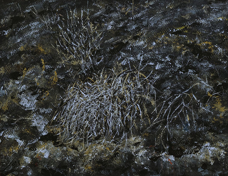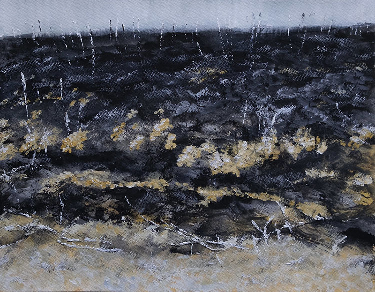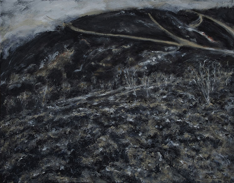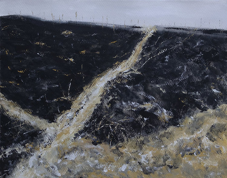 In recent years, environmental disasters have manifested persistently and it has impacted people in every corner of the world. Several months ago, I visited a regional park, and instead of the greenery, I was greeted with a charred and otherworldly landscape. The park had been ravaged a short while before and I was deeply moved and made this series of oil and gouache paintings, portraying the devastation and the eerie beauty of that infernal.