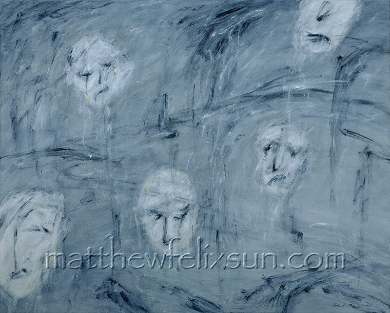 Through a blurry, fluid, and background randomly dissected by some diagonal strokes, several uncertain, twisted, and sad faces emerged, telegraphing the terrified and oppressed people in our uncertain and increasingly inhospitable time and climate, and they were my observation and report in my recent painting Piñatas. The fear, the apprehension in their averting eyes, and the tears streaming down their downcast faces, pulled in and turned away the viewers by our collective shame over our helpless fates and our inability to avoid disasters. We were all beaten piñatas.