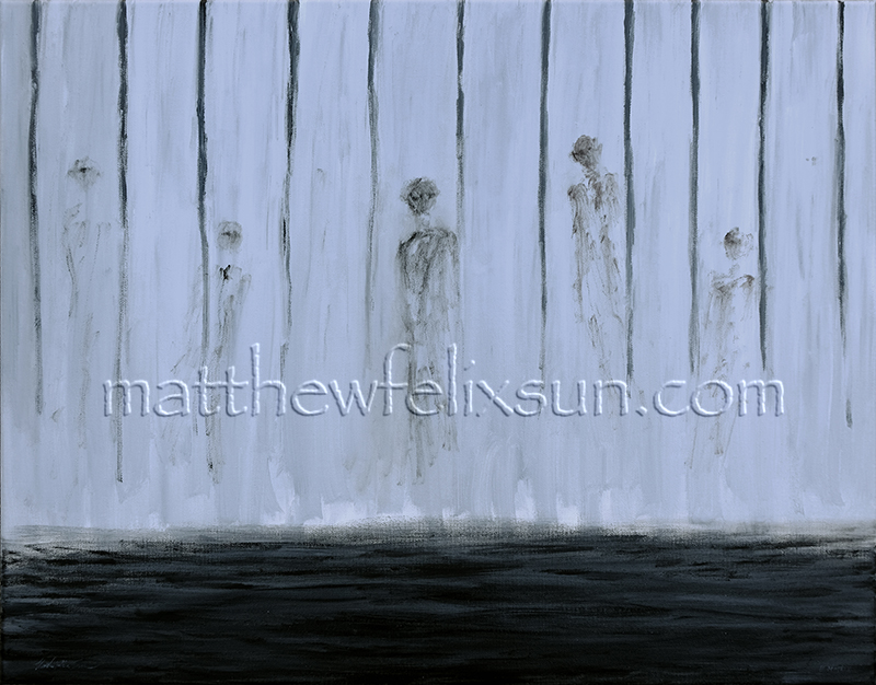At first glance, Emergence is a calm sliver of routine life due to the simplicity of its composition and color scheme; upon closer inspection, what emerged from this picture was not so simple, rather it revealed something indecipherable and with a hint of sinisterness: against a sparse backdrop, a few curious looking, semi-translucent figures floated like ghosts from behind thin vertical bars, which made the whole landscape reminisce of a jail cell, despite the openness of those bars. What was emerging? Inner strength? Outside menace? Guilty conscience? Or stoical indifference to anyone’s fate?