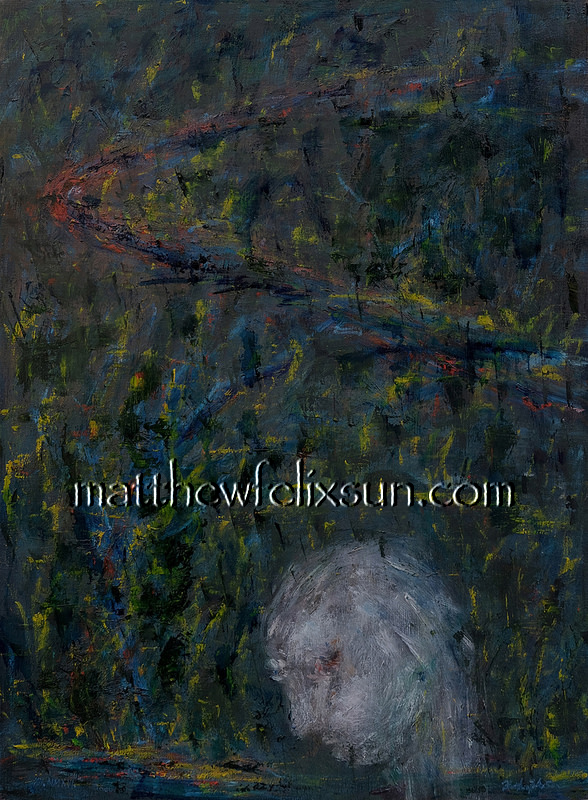 My last oil painting completed in 2016, Remembrance, featured a ghostly profile of a pale and pensive person, occupying lower third of the canvas, head bending down, in deep thoughts, with a barely registered presence. Against this sketchily and thinly painted bust, the strongly accented abstract and dark background, asserted itself strongly, and became obvious the representation of the things to remember, a commentary to his thoughts. Perhaps, the winding road or river in the far background reminded him of the toil in the past; perhaps, the repeating pattern of vertical shapes, reminded his of the hopes raised in the past and perhaps not wholly accomplished, or even lost. An apt conclusion to a quite regrettable year of the turbulent 2016.
