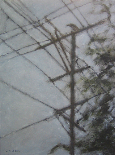 Crows are fascinating animals – omnipresent, prophetic and somewhat sinister. There were many crows hover around my neighborhood and quite often I was struck by the peculiar complex air they exude when they perched high on telephone poles, which dotted and dominated the bleak urban/suburban landscape of my environ.