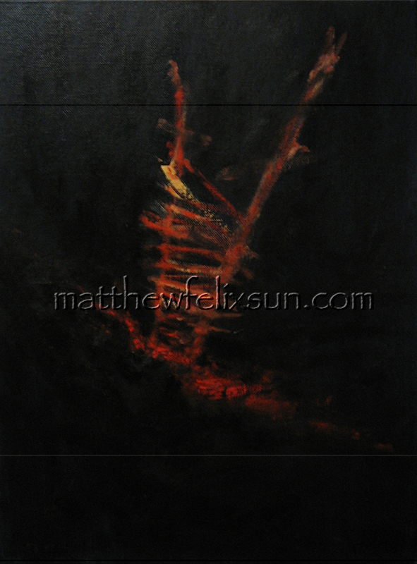 The straightforwardly titled painting is dominated by a large object, glowing red and yellow, sitting on top of an equally glowing red slit – the schism, all of them contrasting strongly against the black background. Smack in the middle of the small canvas, the large object can be seen as an escaping ladder, or a doomed arrow headlong crashing into the schism; or, can even be interpreted as the vary agent who caused the schism, with some tragic results for the environment and perhaps even itself, similar to the reckless behavior of the US on the international stage in the last decade, in particular.
