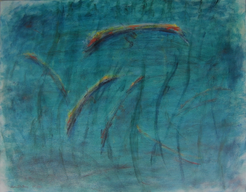 My 2010 oil painting, “Leisurely“, featured a calm body of water in dreamy aqua tint, over which swayed some soft bands, reminiscent of weeds or kelp, intersecting with shorter objects – an array of rowing boats.