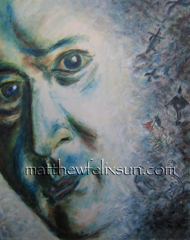 My painting attempted to catalog such sufferings in a collage of iconography images, from Jesus carrying the cross to Calvary, Michelangelo’s slave sculpture, David’s Liberty Leads People, and the hooded abused prisoner in Abu Ghraib. The focal point of the painting is the sad face of an earnest man, personification of the sorrows and compassion of humankind.