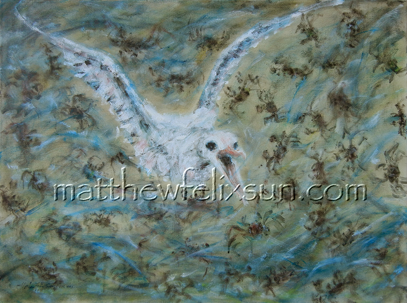 My painting, “Siege”, currently on view at Berkeley’s Arts Passage, in an exhibition titled “Today’s Artists Interact with Major Art Movements from the Renaissance to the Present”, is an almost terrifying work, depicting a wounded seabird being swamped by relentless, aggressive crabs. The painting was inspired by literature, which has played important role in my art making process, as documented in this guest blog on Superstition Review: “Literature Inspired Paintings”.