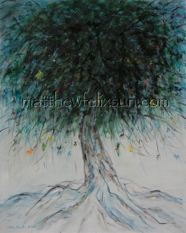 Despite joyous colors of those chairs, their positions are somewhat precarious, manifested in a lone chair underneath the seemingly carefree gathering, clinging to the roots of the tree — knocked down, a fallen one, or a cast out one? It would be up to viewers to interpret.
