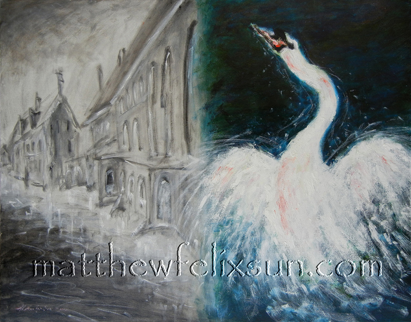 The left side of the painting, in shades of washed-out gray, depicts the Old St. John’s Hospital, an 11th-century hospital in Bruges, Belgium while the right side zooms in one of the omnipresent swans and the symbol of that ancient city, painted in intensely saturated rich hues. I conceived this painting while visiting Bruges, when I was quite intrigued and even moved by the stark contrast of immobile and somewhat faded history and threadbare nobility, and the living creatures full of grace, energy and slight menace.