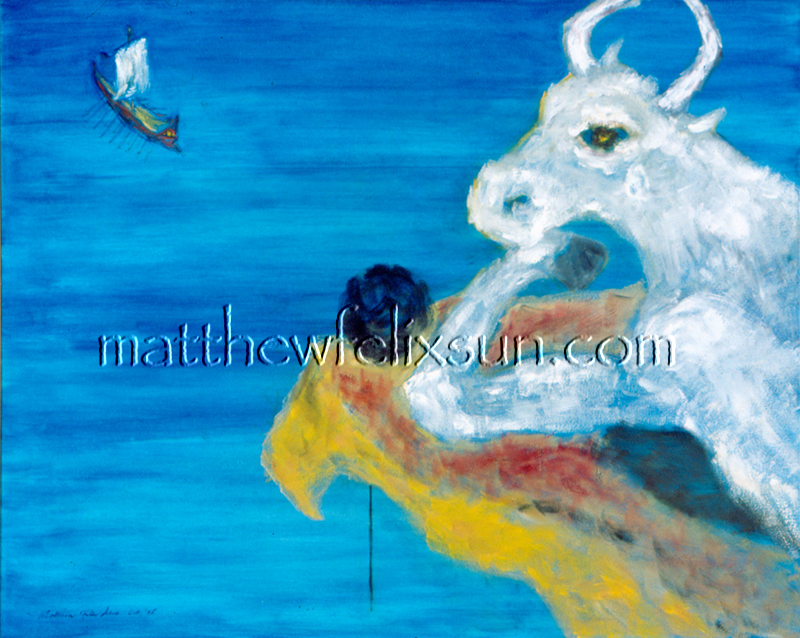 The strangest aspect of the legend was that Minotaur had a head of a bull, which was not a natural carnivore, therefore it would not be far-fetched to imagine how sickened he was by his own savagery, thus I treated this subject in my oil painting, Minotaur.