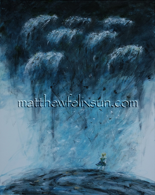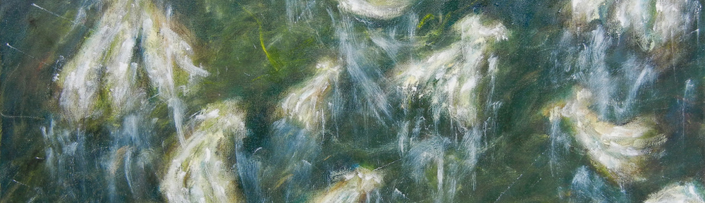 Despite some success of my 2015 painting Waft, which was recently published by Pomona Valley Review (Volume 11, Summer 2017), I clearly saw rooms for improvement, and recently I made a new version of the painting, titled Wafting — much darker and more dramatic, with additional whimsicality and humor, lent by the black flakes, resembling playful butterflies, darting above the little girl, who was, as in the 2015 version, running away from the viewer, holding strings tied to floating human balloons, all in the shape of young women dressed in pure white, against much darker and more ominous background, as if in the process of awakening or drowning. I believe that the latter effort was psychologically more penetrating and indeed a big improvement.
