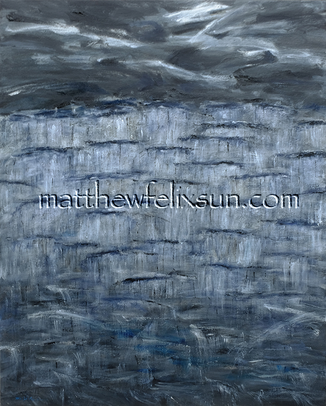 A landscape as an enigma is the impression of my monochromatic oil painting, Interlocked, which depicts a semi-abstract, difficult to decipher landscape, under the threat of heavy and broadly zigzagged clouds in the upper region, while underneath, an orderly and calm swatch of staggered and slightly angled roofs, indicates order, and furthermore, social hierarchy and constraints. The dripping liquids permeating the landscape lends the notion of connectedness and the interlocking nature of the environment, natural or man-made.
