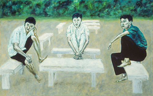 One of my best portraits was a group of young men, me in the middle and two college friends at the two sides of the canvas. We sat on stone benches, looking serious and somewhat despondent, and aimed our eyes away from another, into different directions. It was a moment of uncertainty, a private consultation in a group setting, a dialogue with oneself, and a congregation without exchanges. I titled it “Interaction”. My relatively broad brushstrokes rendered the bushes in the background a hallucinatory backdrop, and the deliberately bland facial features were economically outlined – a kind of abstraction.